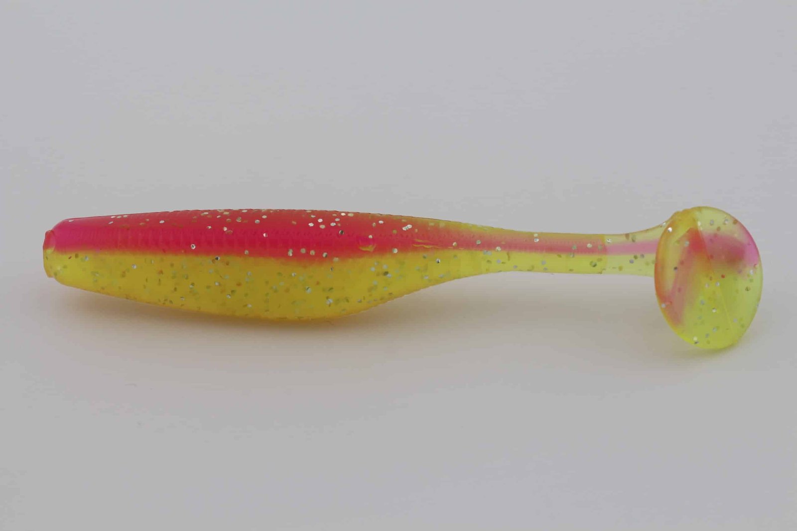 Electric Chicken is built with a NeoPink back and a CharLime belly, giving the bait a clear top-to-bottom contrast that reads naturally in the water. Suspended glitter—Silver (Ag47) (0.025″) (1/8 tsp)—adds controlled flash that mimics scale flicker as the bait rolls, swims, or pulses.