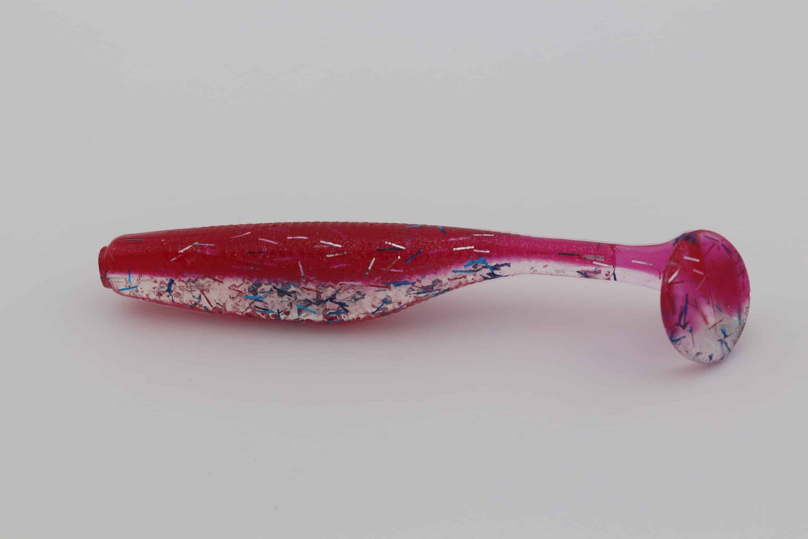 Firecracker is built with a Redrum back and a Snowshine belly, giving the bait a clear top-to-bottom contrast that reads naturally in the water. Suspended glitter—Royal Blue Whisker (1/8 tsp), Silver Whisker (1/8 tsp)—adds controlled flash that mimics scale flicker as the bait rolls, swims, or pulses.