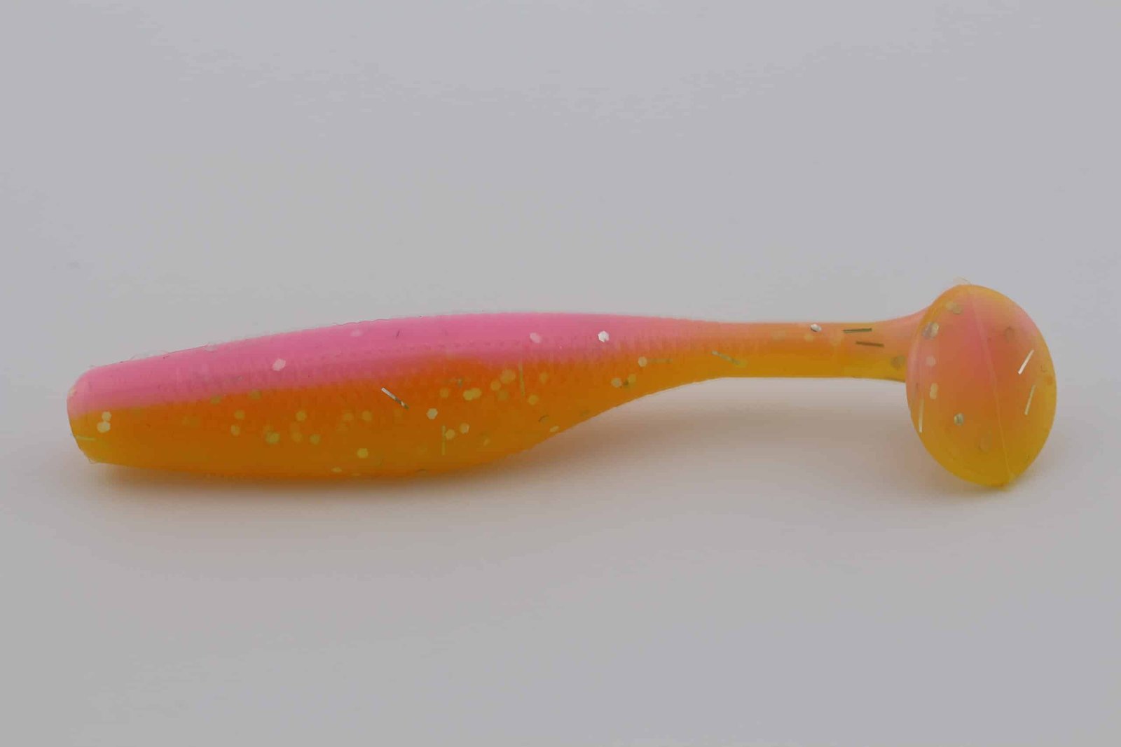 GG is built with a Chewy back and a Sunshine Yellow belly, giving the bait a clear top-to-bottom contrast that reads naturally in the water. Suspended glitter—White (.040″), Silver (.040″), Silver Whisker (1/16 tsp), Glow Purple (1/16 tsp)—adds controlled flash that mimics scale flicker as the bait rolls, swims, or pulses.
