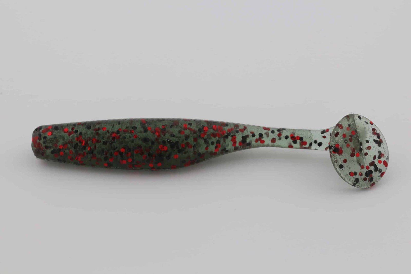 Watermelon Red leans on a Dark Melon profile to create a confident silhouette that fish can track. Suspended glitter—Fire Red 4202 (0.040″) (1/4 tsp), Black 4201 (0.040″) (1/8 tsp)—adds controlled flash that mimics scale flicker as the bait rolls, swims, or pulses.